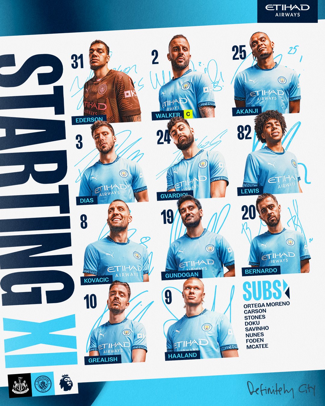 曼城首发:埃德森、沃克、阿坎吉、迪亚斯、格瓦迪奥尔、刘易斯、科瓦契奇、京多安、B席、格拉利什、哈兰德。